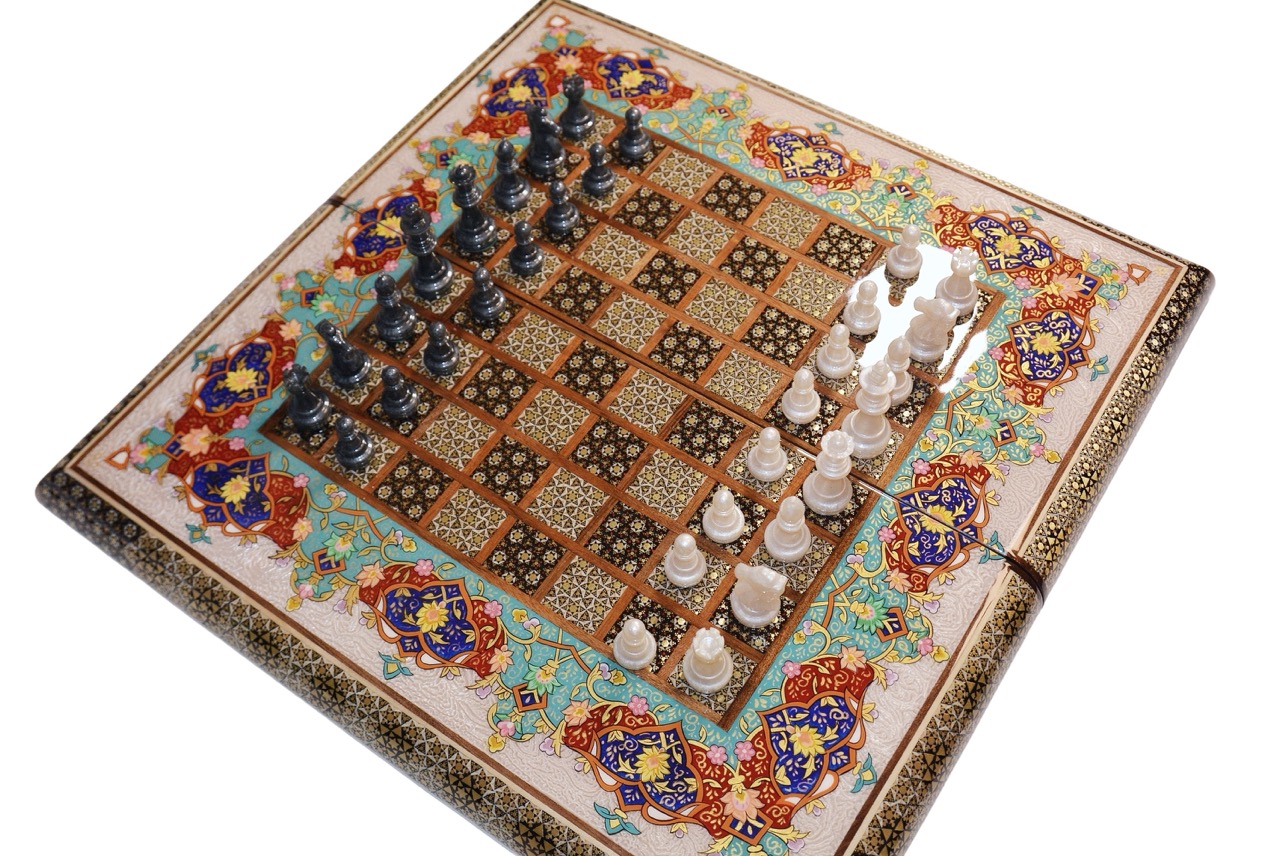 Erleben Sie die Kunst des Spiels mit unserem handgefertigten, doppelseitigen Backgammon- und Schachbrett in traditioneller persischer Khatam-Intarsienkunst. Dieses luxuriöse Brettspiel kombiniert blau- und Gelbtöne in einem filigranen Blumenmuster, das mit hochwertiger, vergoldeter Handmalerei veredelt wurde. Jedes Detail, von den feinen Holzeinlagen bis hin zur glatten Oberfläche, spiegelt meisterhafte Handwerkskunst wider.
