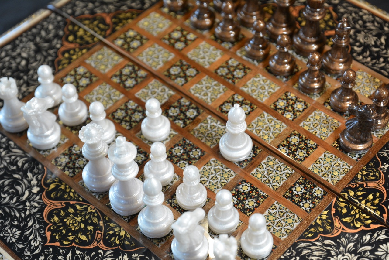 Schachbrett und Backgammon aus Holz mit Blumenmuster und Intarsien-Design