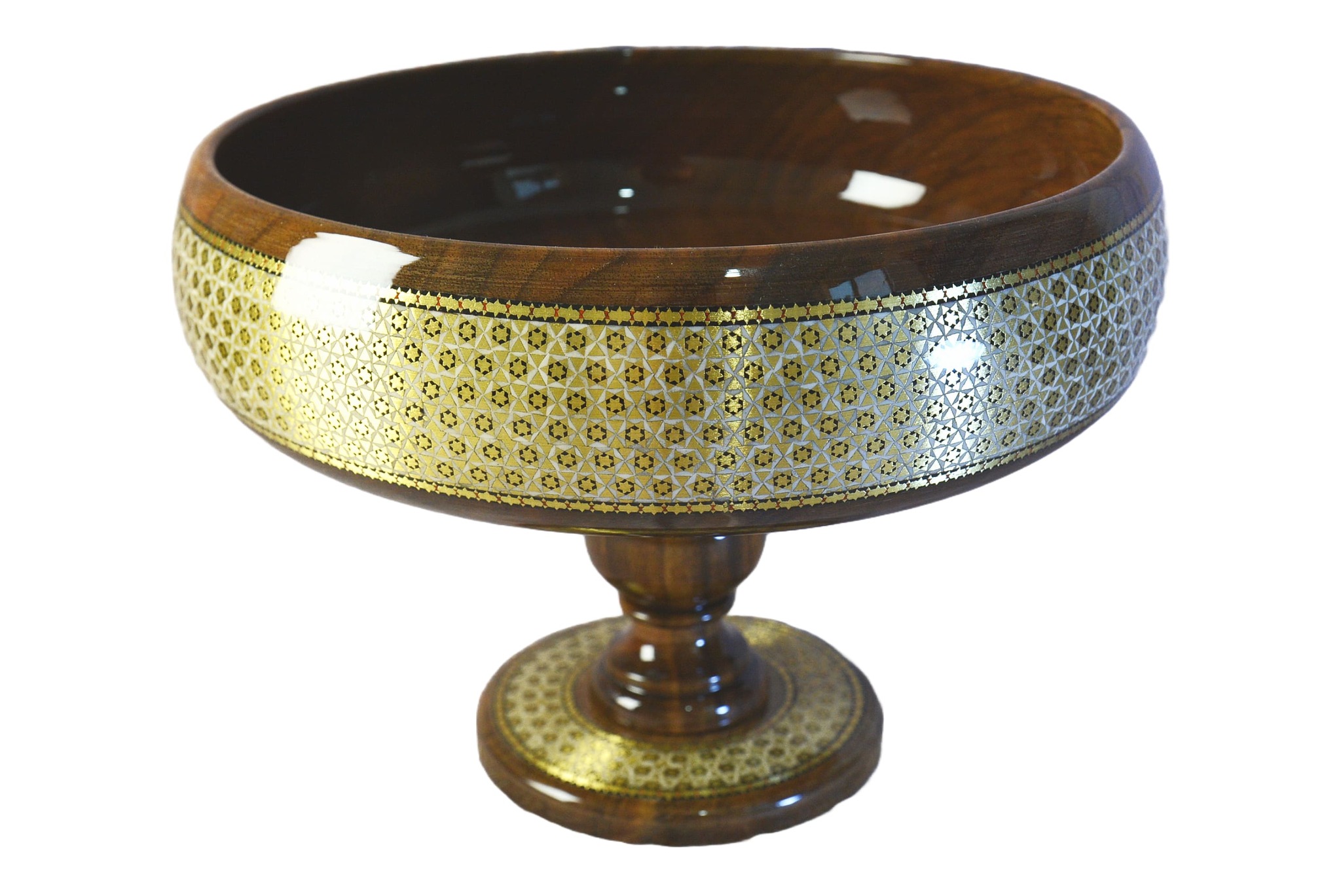 Diese exquisite Obst- und Pralinenschale aus dunklem Holz vereint traditionelle Khatam-Handwerkskunst mit zeitgenössischer Eleganz. Mit einem Durchmesser von 25 cm und einer Gesamthöhe von 15 cm bietet sie großzügigen Platz für Ihre Leckereien. Das Highlight ist die meisterhaft gearbeitete Khatam-Intarsie, die sich in einem faszinierenden geometrischen Muster um die Schale und den Standfuß zieht. Die hochwertige Polyester-Schutzschicht verleiht der Oberfläche einen edlen Glanz und schützt das kunstvolle Design. Die Schale mit 7 cm Tiefe eignet sich perfekt für die Präsentation von Obst, Pralinen oder Snacks. Jedes Stück ist ein handgefertigtes Unikat und verleiht Ihrem Zuhause eine besondere orientalische Note. Der gedrechselte Standfuß sorgt für einen eleganten und stabilen Stand auf jedem Tisch oder Sideboard. Die Kombination aus traditioneller Handwerkskunst und praktischer Funktionalität macht diese Schale zu einem außergewöhnlichen Schmuckstück für Ihr Zuhause.