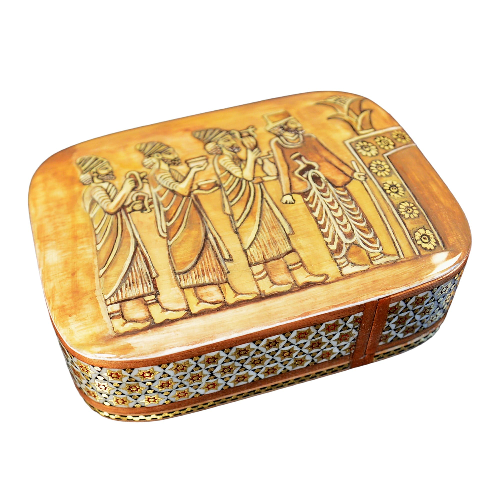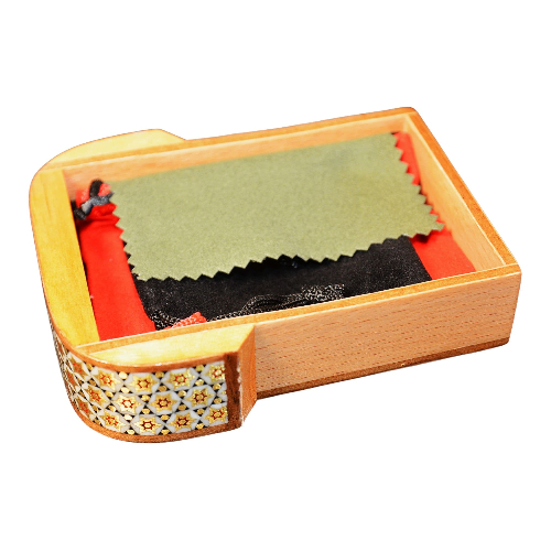 Das Schmuckkästchen mit Khatam-Arbeiten besteht aus hochwertigem Khatam und einer Polyesterbeschichtung und gehört zu den praktischen Kunsthandwerksprodukten. Diese Box wird zur Aufbewahrung von Schmuck, Geschenkkarten, Spielkarten, Münzen usw. verwendet. In der persischen Enzyklopädie über Khatam-Arbeiten und Khatam-Herstellung heißt es: Die Kunst, die Oberfläche von Gegenständen in einer Art Mosaik mit kleinen Dreiecken zu verzieren. Diese Dreiecke werden aus verschiedenen Holzarten, Metall und Knochen hergestellt. Je kleiner und feiner die Dreiecke sind, desto hochwertiger ist die Khatam-Arbeit. In einem Khatam-Muster werden für die kleinste geometrische Einheit mindestens drei Dreiecke und für die größte maximal vierhundert Dreiecke verwendet.